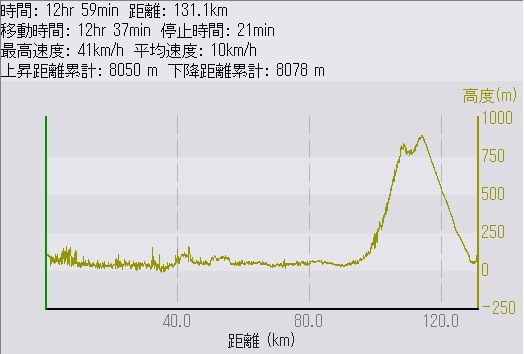 移動距離131.1km。箱根峠で高度877m。最高速度41km/hは箱根峠をカッ下った時のもの・・・怖かったよ~
