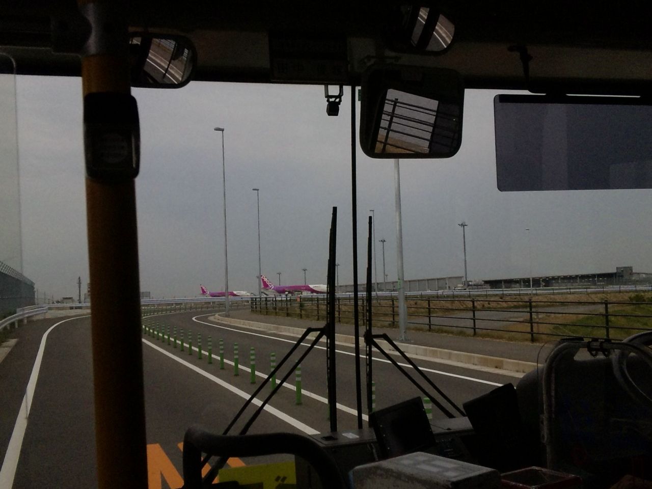 バスで移動する。「peach」の機体が見れてこれはこれでなかなか良い。