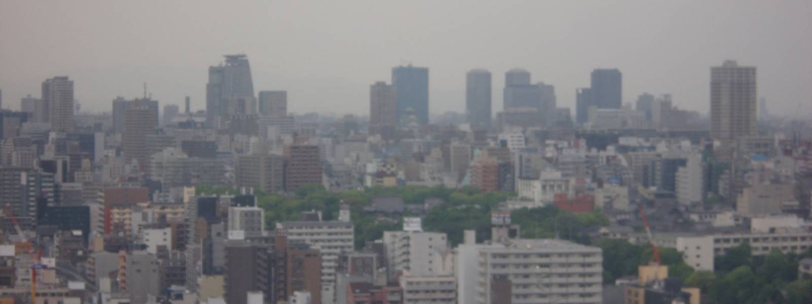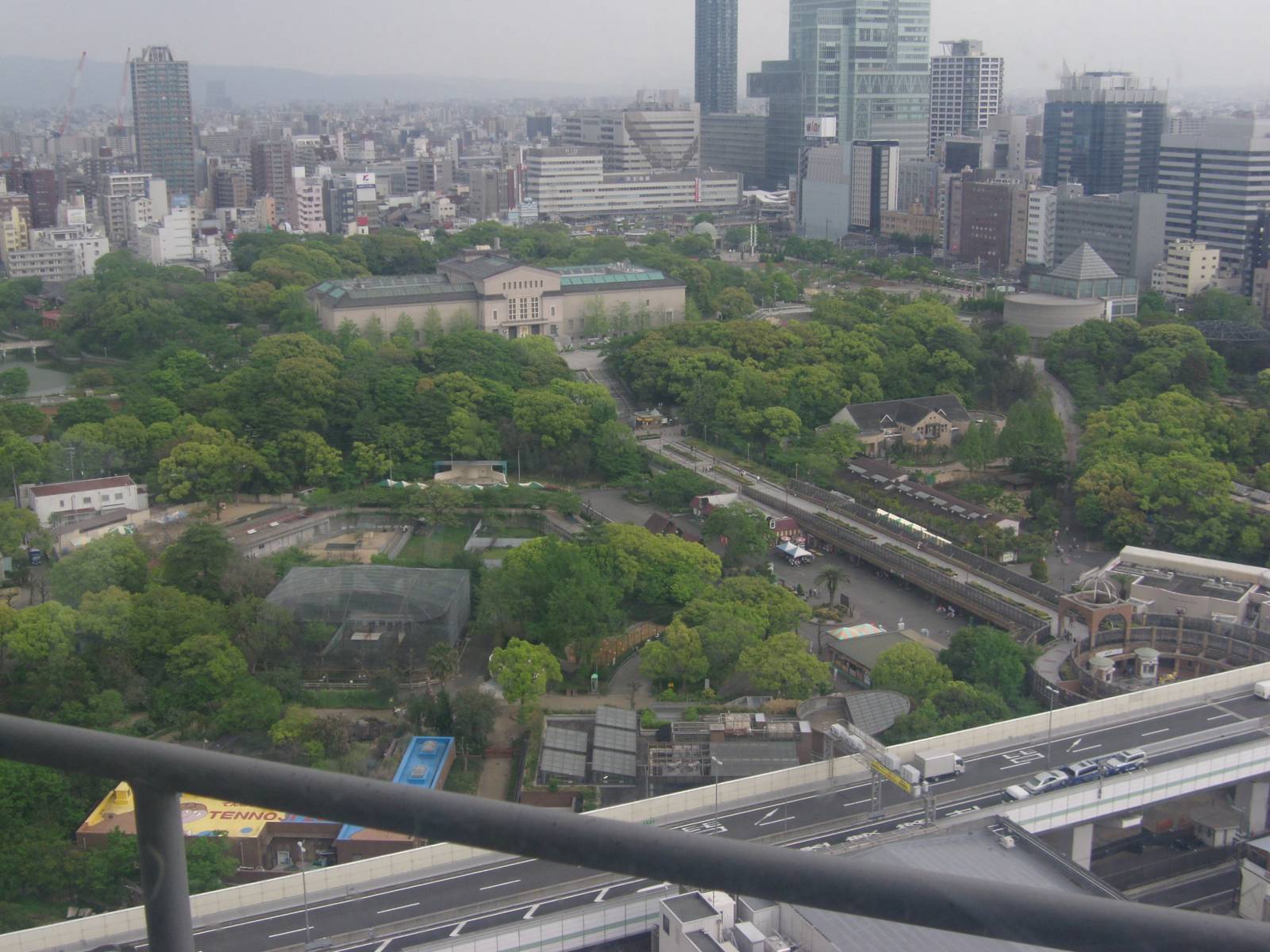 通天閣の展望台まで上がってきた。中央に大阪城が小さく見える。分かるかな? 残念ながら空が曇り、遠くが霞んでよく見えない。