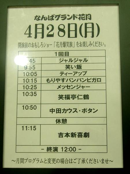 で、明けて3日目(4/28)は、大阪を楽しんだ後は飛行機で福岡まで移動だ。なかなかヘビーな一日だ。9時45分開演の吉本新喜劇を見にホテルを出る。南海なんば駅の横を通り「なんばグランド花月」へ。ホテルからは歩いて約30分ほど。