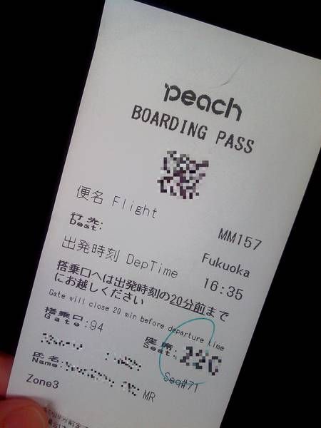 いよいよ搭乗、初peach! 福岡空港には17時45分に到着予定だったが天候不順で着陸が遅れ18時ちょうどの到着した。大阪発のpeachでは、標準語で機内アナウンスした後に、「毎度、おおきに!」と大阪弁でお礼を言う。なんとも変な違和感があり、乗客からは苦笑いが漏れていた。
