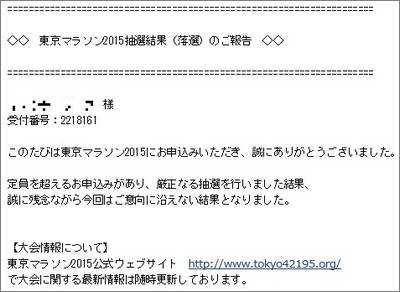 ホーム > 日常 > 東京マラソン2015抽選結果(落選)のご報告 2014/09/26 日常 予想はしていたが見事に落選でした。抽選倍率10.6倍!どうしたら当選できるのでしょうかね。めげづに来年もエントリーしたいと思います。 - 日常 おすすめ記事 東京マラソン2013抽選結果(落選)のご報告 SoftBankカードが届いたぞ 水道はいつ来るんだろう? そうだ選挙、行こう!(その3 投票) 年末年始は11連休だーー!! 期間工生活も残りわずか? 今後の予定は・・・