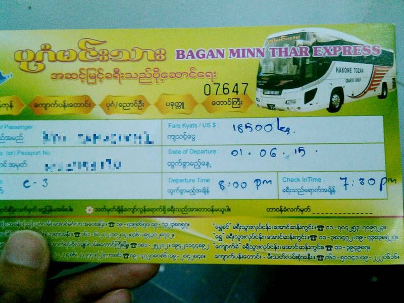 バガン行きのバスは「BAGAN MINN」のVIPバスだった。運賃は18,500チャット(約2,100円)です。チケットにはバスの写真が印刷されているが、よくよく見てみると・・・