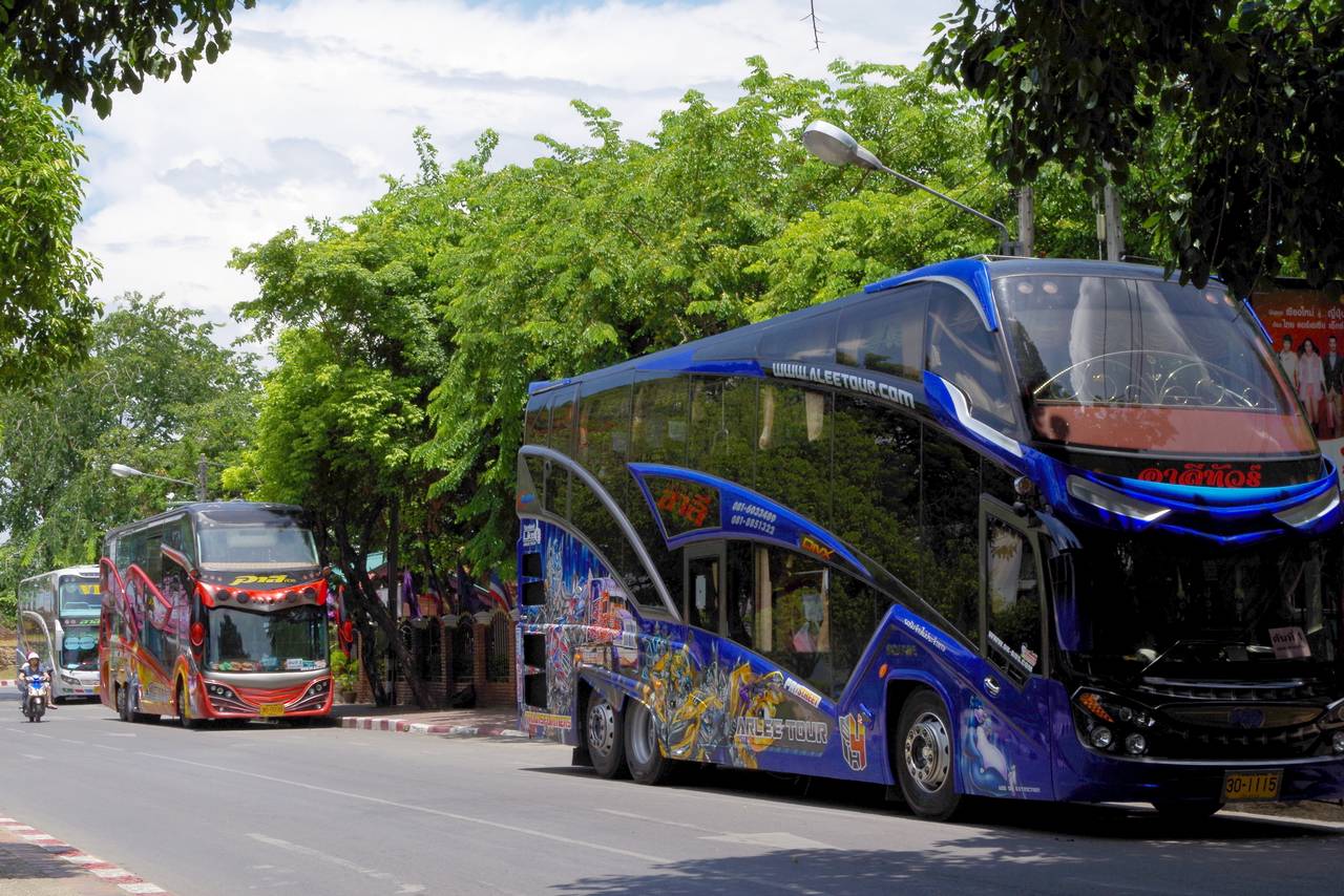 東南の角の城壁から少し行くと内側の道路にツアーバスが数台停まっていました。タイのバスはとても派手です。豪華なバスになればなるほど外観が派手になります。見るからに3列シートのVIPバスのようです。さあ、アユタヤへはバスで行こうか、列車にしようか? またまた悩みます。ほぼ列車と決めていたのだけどね。