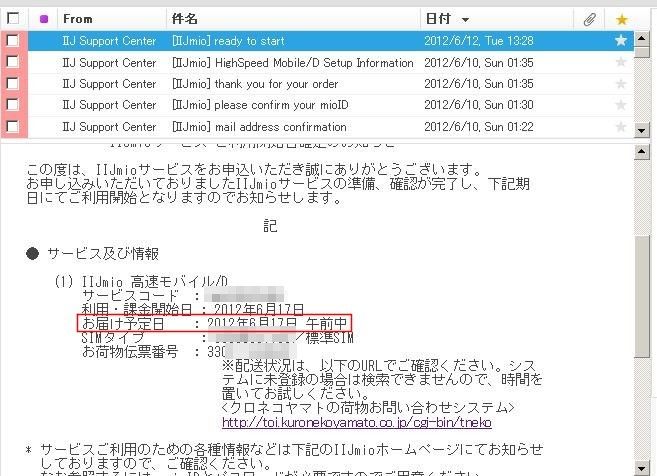 プランを申し込むと”[IIJmio] thank you for your order”とメールが届き、申し込み完了。さらに、2日後の12日にはサービスの設定も完了し、SIMも配送された模様。商品の受取日は6月17日を指定。simの到着日がサービス開始日となるので、b-mobile Fairの期限切れの前日を指定しました。ちょうど日曜日だったので都合もいい。IIJsimをネタにブログでも書こうかと・・・ 朝、早起きしてSIMの到着を待っていました。ここまでは順調です。